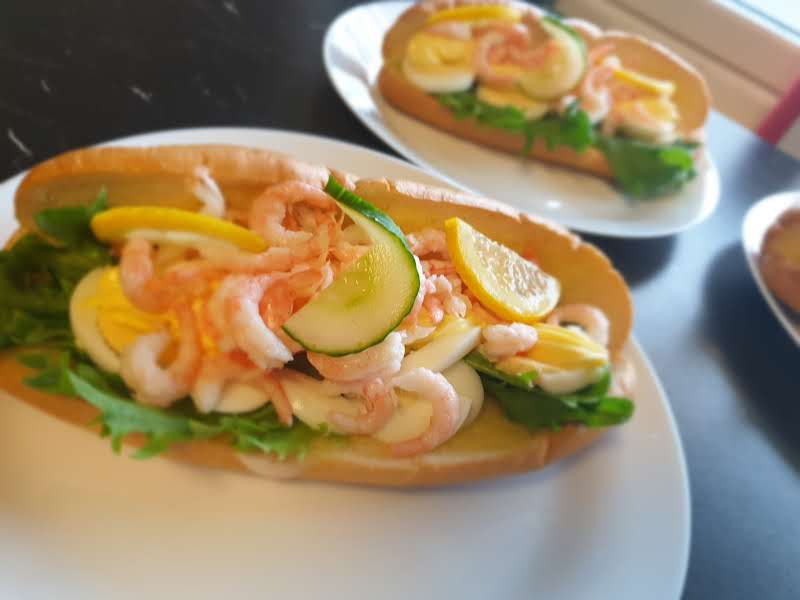 Innehhåll: Smör, sallad, ägg, majonnäs, räkor, citron och gurka.