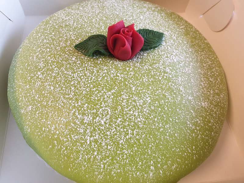 10 bitar marsipantårta som vanligtvis har grön marsipan. Självklart går det att önska annan färg.